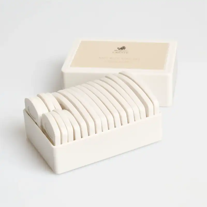 Strikkeblokkerne leveres i en praktisk plastkasse. Der er i alt 20 strikkeblokkere: 12 lange med 8 nåle og 8 korte med 4 nåle.