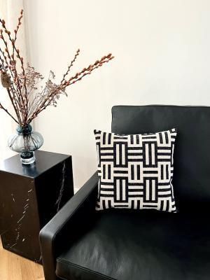 Koksgrå og mandel, elegant og klassisk farver. Vi elsker simpelthen denne enkelte pude, men alligevel fængslende for øjet at kigge på. En forholdsvis nem pude at broderer, med det enkelte og grafiske mønster i kun to farver.