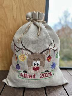 Julegavesæk som broderikit, her broderes efter tællemønster