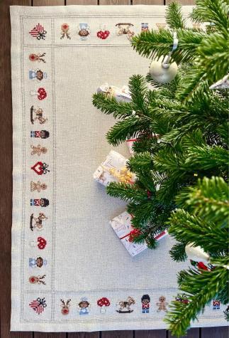 Med dette juletræstæppe er der lagt op til hygge med hele familien. Her er en fin bord fyldt med ingefær småkage figurer, der skal forestille en engel, Rudolf, soldat, hjerte, gave, svamp og kagefigurer. De broderes med uldgarn på 5 trådet Floba.