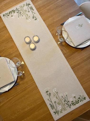 Broderikit til smuk løber, med hvide vilde blomster i hver ende af løberen.