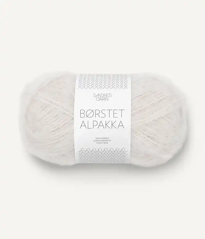 Børstet Alpakka består af alpakafiber tvundet sammen med en stærk nylontråd, som holder det hele sammen når alpakafibrene bliver børstet op. Dette giver et blødt, let og luftigt garn med et loddent udtryk.