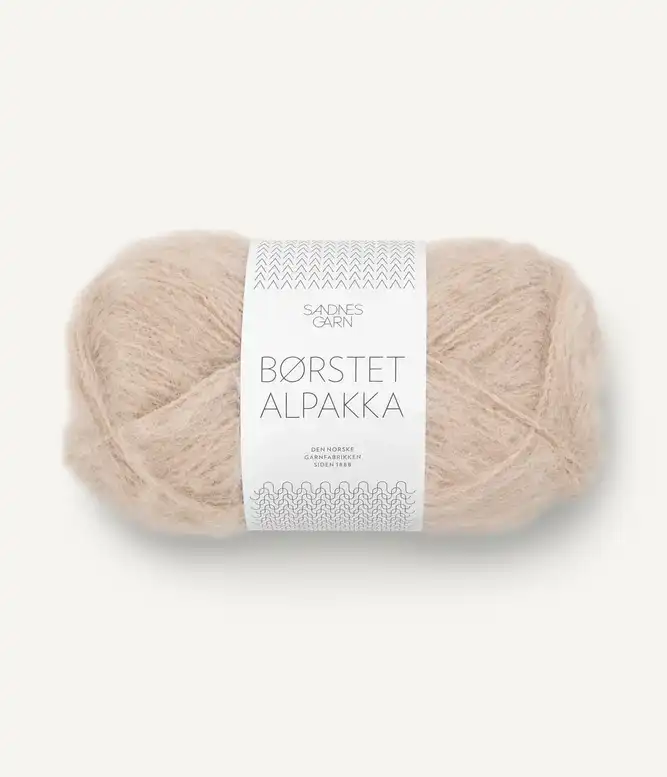 Børstet Alpakka består af alpakafiber tvundet sammen med en stærk nylontråd, som holder det hele sammen når alpakafibrene bliver børstet op. Dette giver et blødt, let og luftigt garn med et loddent udtryk.